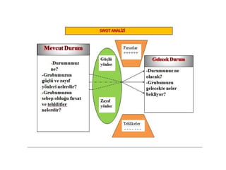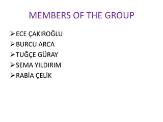 This document introduces the members of a group which includes Ece Çakiroğlu, Burcu Arca, Tuğçe Güray, Sema Yildirim, and Rabia Çelik. For each member, it lists their strengths, weaknesses, opportunities, and threats. The strengths include being enrolled in engineering, easily solving personal problems, having a humane quality, taking responsibility, and having a realistic approach. Weaknesses include language skills, anger issues, a relaxed approach, an unstable personality, and impatience. Opportunities involve family in engineering and traveling abroad. Threats include low self-esteem, empathy issues, variable mood, and courage.