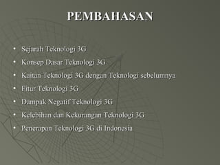 Dokumen ini menjelaskan tentang teknologi 3G, termasuk sejarah, konsep dasar, fitur, dampak, kelebihan, dan kekurangan. 3G merupakan evolusi dari teknologi sebelumnya seperti 2G dan 2.5G yang menawarkan kecepatan akses lebih tinggi dan menggunakan sistem WCDMA. Terdapat juga penjelasan mengenai arsitektur jaringan UMTS dan komponen-komponennya.