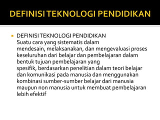 Teknologi pendidikan adalah penggunaan metode sistematis dalam merancang, melaksanakan, dan mengevaluasi proses pembelajaran dengan menggunakan sumber daya manusia dan non-manusia untuk membuat pembelajaran lebih efektif. Teknologi pendidikan meliputi alat bantu visual, audiovisual, komunikasi audiovisual, pendekatan sistem dalam pengajaran, dan teknologi pengajaran. Sejarahnya dimulai dari penggunaan film