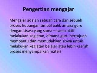 Dokumen ini membahas berbagai teori dan prinsip dalam proses belajar mengajar, termasuk pengertian mengajar dan program pengajaran. Terdapat penjelasan mengenai ranah kognitif, psikomotorik, dan afektif dalam hasil belajar serta komponen sistem instruksional. Selain itu, disebutkan pula strategi belajar, media pembelajaran, dan pengelolaan kelas yang penting untuk menciptakan lingkungan belajar yang efektif.