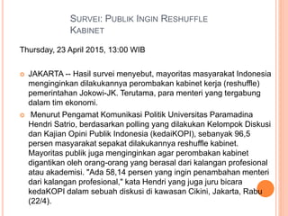 Hasil survei menunjukkan bahwa 96,5% masyarakat Indonesia ingin perombakan kabinet Jokowi-JK, terutama di sektor ekonomi, dengan preferensi untuk menggantikan menteri dengan profesional. Sebanyak 22,67% masyarakat mendukung rotasi menteri, sementara 15,2% ingin menteri dari partai oposisi. Menteri keuangan Bambang Brodjonegoro, yang berhasil dalam pengajuan APBN-P, diakui memiliki kinerja baik di antara menteri lainnya.