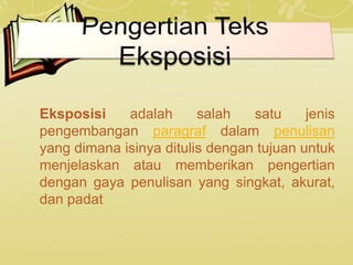 Kelompok 6 membahas tentang eksposisi sebagai jenis pengembangan paragraf yang menjelaskan atau memberikan pengertian secara singkat, akurat dan padat. Struktur teks eksposisi terdiri atas tesis, argumentasi, dan penegasan ulang. Ciri eksposisi menjelaskan pendapat secara informatif dengan menggunakan fakta sebagai alat kontribusi dan konkritasi. Ciri kebahasaan eksposisi menggunakan kata leks