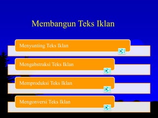Dokumen tersebut memberikan penjelasan mengenai proses-proses dalam membuat dan mengelola teks iklan, mulai dari menyunting, mengabstraksi, memproduksi, hingga mengkonversi teks iklan menjadi bentuk lain seperti video.