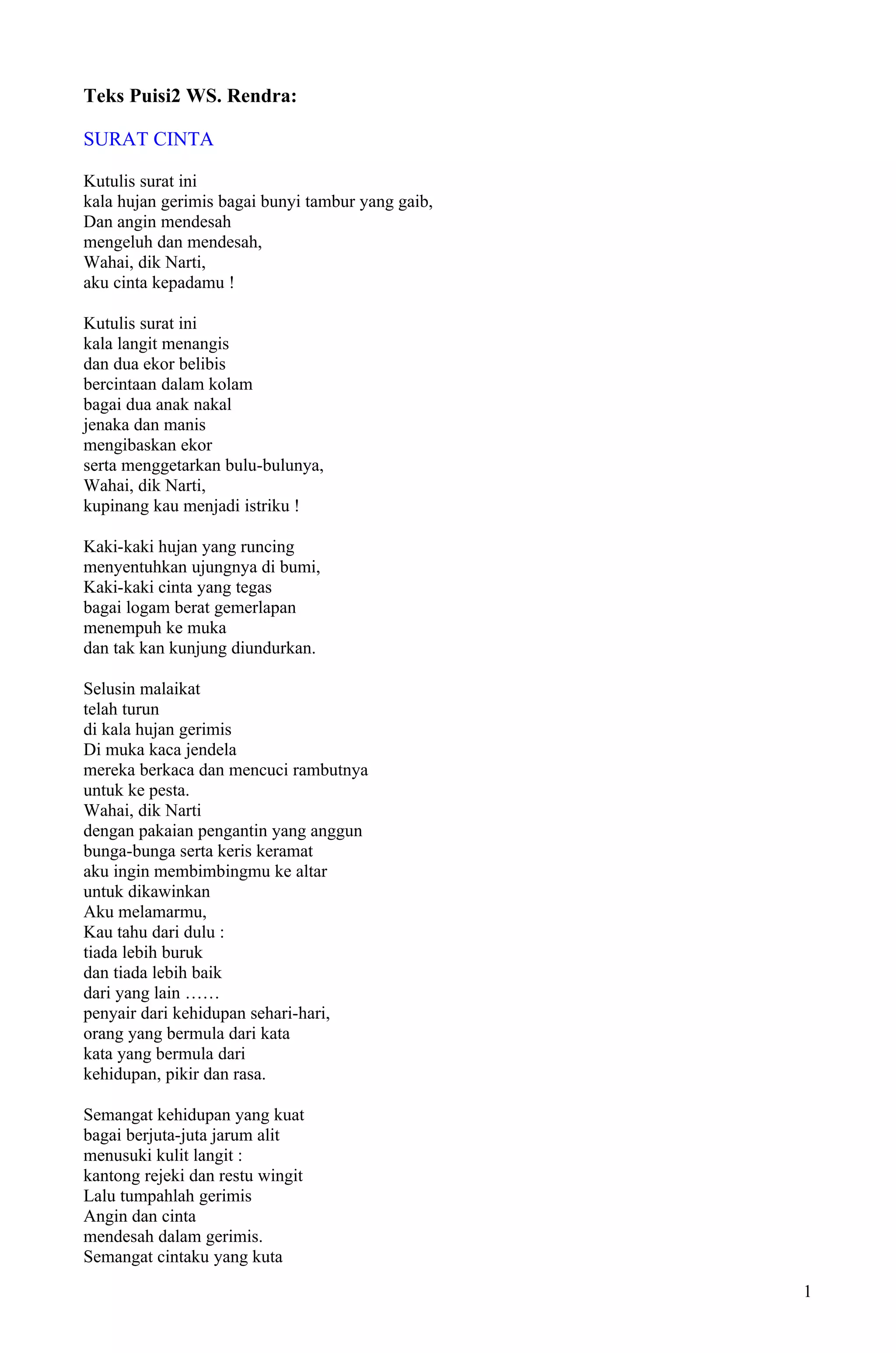 Puisi-puisi ini menceritakan tentang cinta, kemiskinan, dan ketidakadilan sosial. Puisi pertama dan kedua mendeskripsikan perasaan cinta sang penyair kepada seorang wanita bernama Narti. Puisi ketiga menggambarkan kehidupan buruh tani yang menderita kemiskinan meskipun bekerja keras. Puisi selanjutnya menggambarkan kisah cinta antara Joki Tobing dan Widuri yang disaksikan latar belakang kemisk