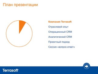 Документ представляет собой презентацию решений CRM и BPM компании Terrasoft, включая отраслевой опыт и преимущества системы. Он охватывает возможности интеграции, управление данными и бизнес-процессами, а также успешные проекты и достижения компании. Также рассматриваются этапы внедрения и механизмы анализа для предотвращения оттока клиентов.