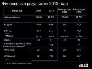 В 2012 году Tele2 Россия показала стабильный рост, увеличив количество абонентов на 10% и выручку на 15%. Ожидается продолжение роста с фокусом на новые регионы и эффективность затрат, с прогнозами выручки в 64-64,5 млрд рублей в 2013 году. Кроме того, компания нацелена на развертывание сетей LTE и достижение технологической нейтральности.