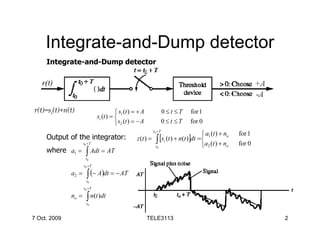This document discusses an integrate-and-dump detector used in digital communications. It describes the operation of the integrate-and-dump detector, showing how it integrates the received signal plus noise over each symbol interval. The output of the integrator is used to detect whether a 1 or 0 was transmitted. An expression is derived for the probability of detection error in terms of the signal amplitude, noise power spectral density, and symbol interval. An example is also provided to calculate the error probability for a given binary signaling scheme and system parameters.