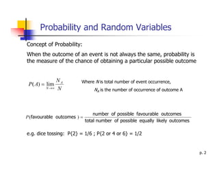 The document provides an overview of probability theory and random variables including: