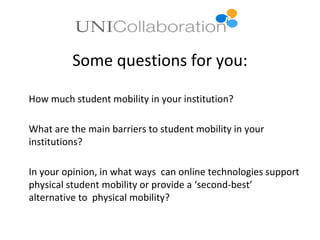 The document discusses integrating virtual and physical student mobility in higher education through telecollaboration. It begins by outlining some common questions about student mobility barriers and how online technologies can support physical mobility. The presentation then defines telecollaboration as online intercultural collaborative projects between distant student groups and provides examples of different virtual mobility set-ups that combine online and physical exchange. Barriers to telecollaboration are addressed, along with strategies to overcome them. Experienced practitioners provide feedback on the impact and popularity of telecollaboration in European universities.