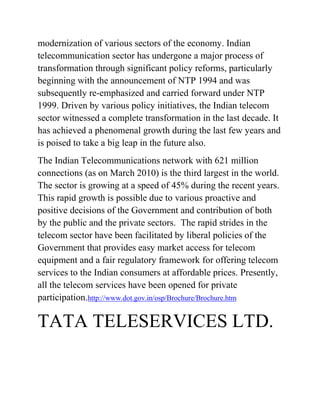 The document discusses the growth of Tata Teleservices Ltd. It states that Tata Teleservices intends to invest over 100 crore rupees annually to develop and market solutions for small and medium businesses. It has already invested hundreds of crores in its SMB business. Going forward, it plans to collaborate with handset makers and tablet manufacturers to offer customized devices for SMB customers. The company aims to invest hundreds of crores every year in its SMB business. It sees potential in serving SMBs' needs for improving productivity through technology and telecom services.