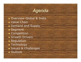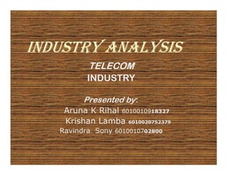 The Indian telecom industry has experienced rapid growth with over 846 million subscribers as of March 2011. It is dominated by private operators who hold 88% of the wireless market share. While demand continues to grow with increasing rural penetration, supply currently exceeds demand due to the large number of service providers. This high competition has led to decreasing revenue metrics like ARPU and MoU. The industry is expected to continue growing driven by technology advancements, lower tariffs, and the shift to value-added services. However, it faces challenges around heavy regulation and maintaining profitability.
