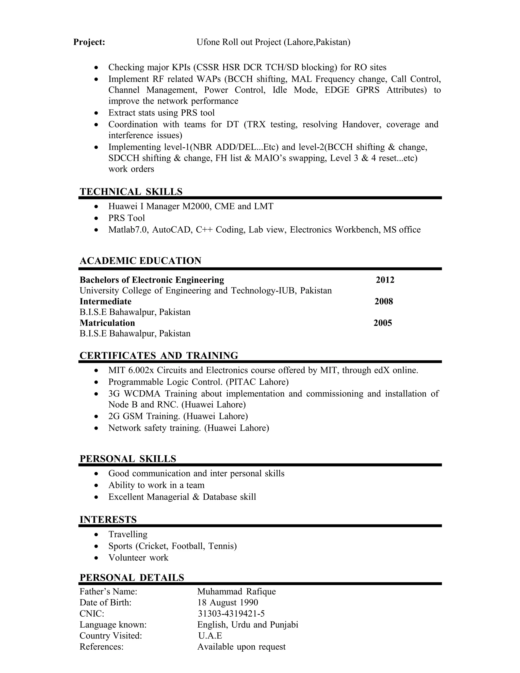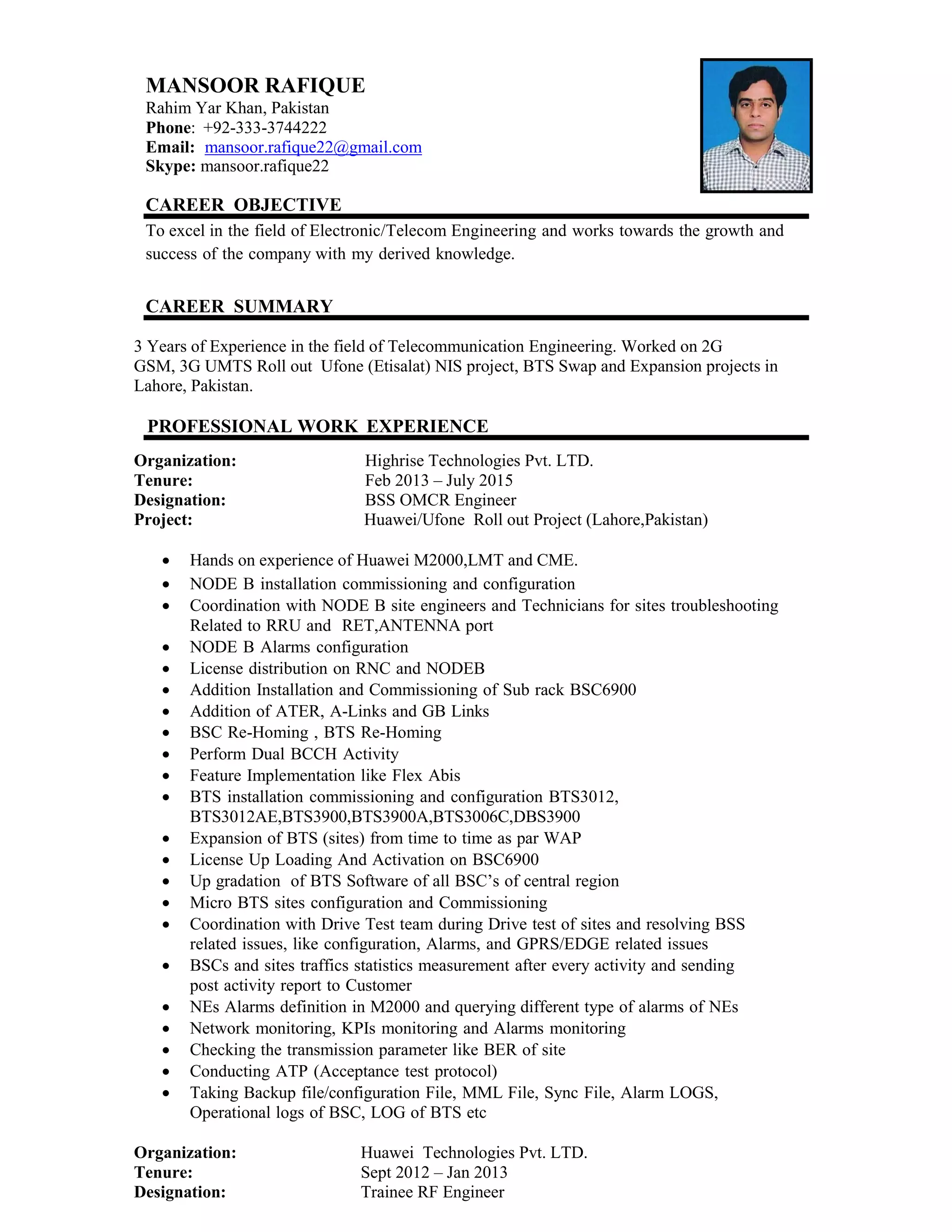 Mansoor Rafique is a telecommunication engineer from Rahim Yar Khan, Pakistan seeking new opportunities. He has 3 years of experience working on 2G and 3G mobile network rollouts and expansions in Pakistan. His experience includes installing, configuring, and troubleshooting NodeBs, BTSs, and BSCs for networks built by Huawei and Ufone.