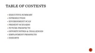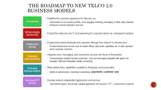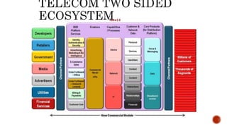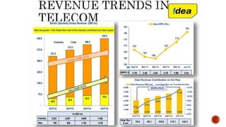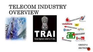 The document discusses the telecom industry in India. It provides an overview of key metrics of the industry such as revenue, number of subscribers, market share of major players, and average revenue per user. It also examines the industry structure and distribution channels. Recent trends are mentioned such as the growing importance of rural subscribers, internet, and broadband. Challenges and opportunities for the industry are highlighted. The telecom industry's impact and relationship with other sectors like infrastructure, mobile devices, banking, education and healthcare are briefly covered.