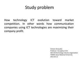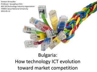 This document discusses the evolution of the telecommunications industry in Bulgaria toward increased market competition through new technologies. It provides an overview of the key players in the mobile communication and internet access markets in Bulgaria, including the historical development from state-owned monopolies to increased privatization and competition. The mobile market is now saturated, so companies are diversifying services like mobile internet and IPTV to increase profits. Regulation by the Communication Regulation Commission aims to implement policy while removing barriers to market entry for internet service providers.