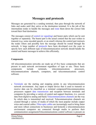 A telecommunications network connects terminals, links, and nodes to enable telecommunication between users. It uses addresses to route messages or connections to the correct recipients. A telecommunications network consists of terminals, processors, channels, computers, and control software that work together to transmit and receive data.