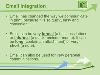The document discusses various communication technologies that can be integrated into classroom instruction including email, instant messaging, VoIP, video streaming, and Skype. These technologies allow for real-time communication and collaboration between students and with experts outside the classroom. When used creatively, these disruptive technologies can increase student motivation, engagement, and development of 21st century literacy skills.