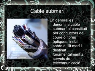 Telecomunicacions 1. 2. Cable submarí En general es denomina cable submarí al constituït per conductors de coure o fibres òptiques, instal sobre el llit marí i destinat fonamentalment a serveis de telecomunicació. Una secció transversal. 1. Polietilè. 2. Cinta de mylar. 3. Filferros d'acer trenat. 4. Barrera de alumini resistent a l'aigua. 5. Policarbonat. 6. Tub de coure o alumini. 7. Vaselina. 8. Fibres òptiques. 3. 4. 5. 6.