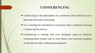 This document discusses different types of teleconferencing including audio and video conferencing. It defines teleconferencing as linking people across locations using electronic means. There are several types such as audio, video, and computer conferencing. Benefits include saving time and costs by moving information instead of people. Limitations include lack of non-verbal cues, visual presentations, and complex interpersonal communication being more difficult remotely. Audio conferencing allows two-way conversation over phones while video conferencing adds video capability for more face-to-face interaction, but also has higher setup costs and technical difficulties.