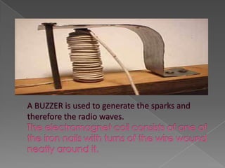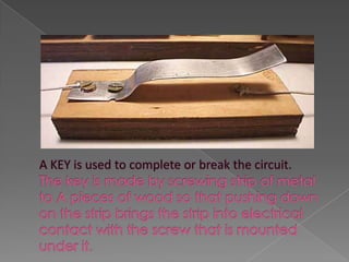 Pushing the telegraph key completes an electrical circuit that causes an electromagnet coil to click when pulled down, making a dot. Releasing the key causes the coil to clack as the metal strip springs up, making a dash. Operators can differentiate dots from dashes based on the distinct click and clack sounds produced when the electromagnet pulls and releases the metal strip.