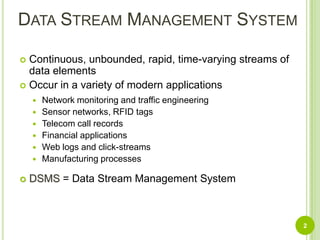 The document discusses TelegraphCQ, a data stream management system developed at Berkeley University for processing continuous and time-varying data streams. It details its architecture, including the use of PostgreSQL, the concept of eddy for adaptive query processing, and various components like wrappers and modules for efficiently managing data. The document also covers specific features such as load shedding, querying capabilities, and adaptations for dynamic data environments.