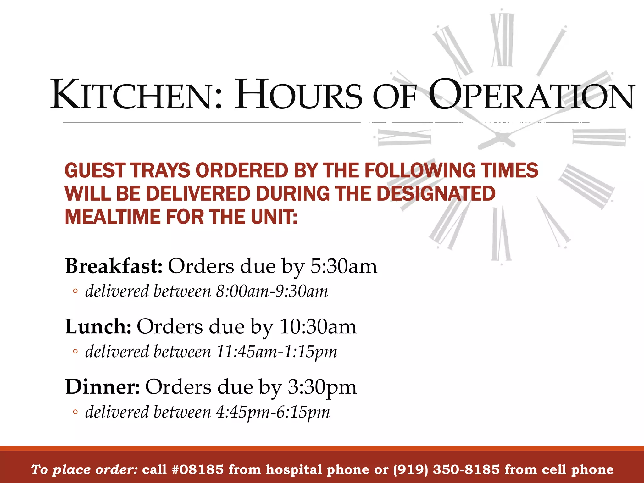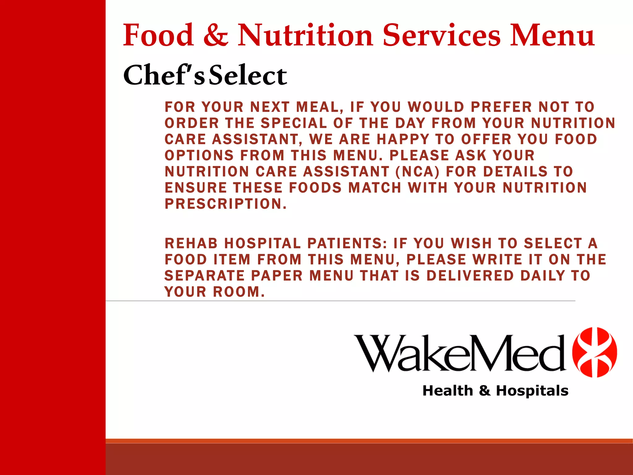 The document provides a menu and ordering instructions for patients at WakeMed Health & Hospitals in Raleigh, North Carolina. It lists a variety of meal, snack and beverage options along with their nutritional information. The menu includes entrees, sandwiches, soups, sides and breakfast foods. Ordering details are provided, noting that orders must be placed by certain times to receive meals during designated serving periods.