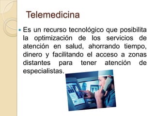 La telemedicina permite optimizar los servicios de atención en salud mediante el uso de tecnologías que ahorran tiempo y dinero y facilitan el acceso a especialistas en zonas distantes. Se aplica principalmente en prácticas como telediagnóstico, teleconsulta y monitoreo remoto, así como en educación médica a distancia. En Colombia, el Centro de Telemedicina de la Universidad Nacional ha implementado servicios de consulta especializada y cuidados intermedios en 43 municipios de 11 departamentos usando esta modalidad.