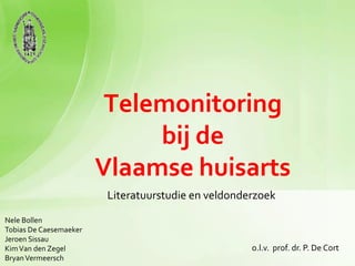 The document summarizes a literature review and field research on telemonitoring by Flemish general practitioners. It examines telemonitoring for arterial hypertension, heart failure, and diabetes mellitus. For arterial hypertension, meta-analyses show telemonitoring improves systolic blood pressure by 4-5 mmHg and diastolic blood pressure by 1.5-2.5 mmHg. Telemonitoring may also allow for more timely medication changes. However, its impact on hard clinical endpoints like mortality remains unclear. The literature review on heart failure and diabetes is still ongoing.