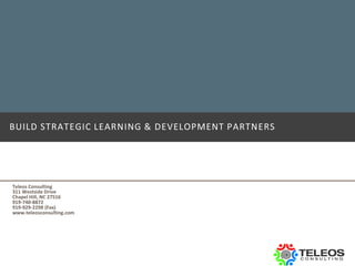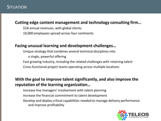 Teleos Consulting is a $1 billion global consulting firm with 10,000 employees spread across four continents. They faced challenges retaining talent and developing critical skills across business units and locations. Their goal was to improve talent development and the reputation of the learning organization.