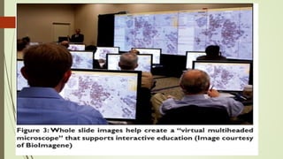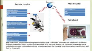 Telepathology involves the digital imaging of pathology specimens and transmitting the images electronically to allow pathologists to render diagnoses remotely. There are three main telepathology systems: static image systems which transmit still images, dynamic systems which provide real-time video transmission, and virtual slide imaging which digitizes entire slides. Telepathology has advantages like allowing expert second opinions and intraoperative consultations, but also challenges like needing standardized criteria and training pathologists in its use to ensure diagnostic accuracy is maintained. While showing promise, telepathology has seen limited adoption in India due to issues around technology, standards, training, and infrastructure.