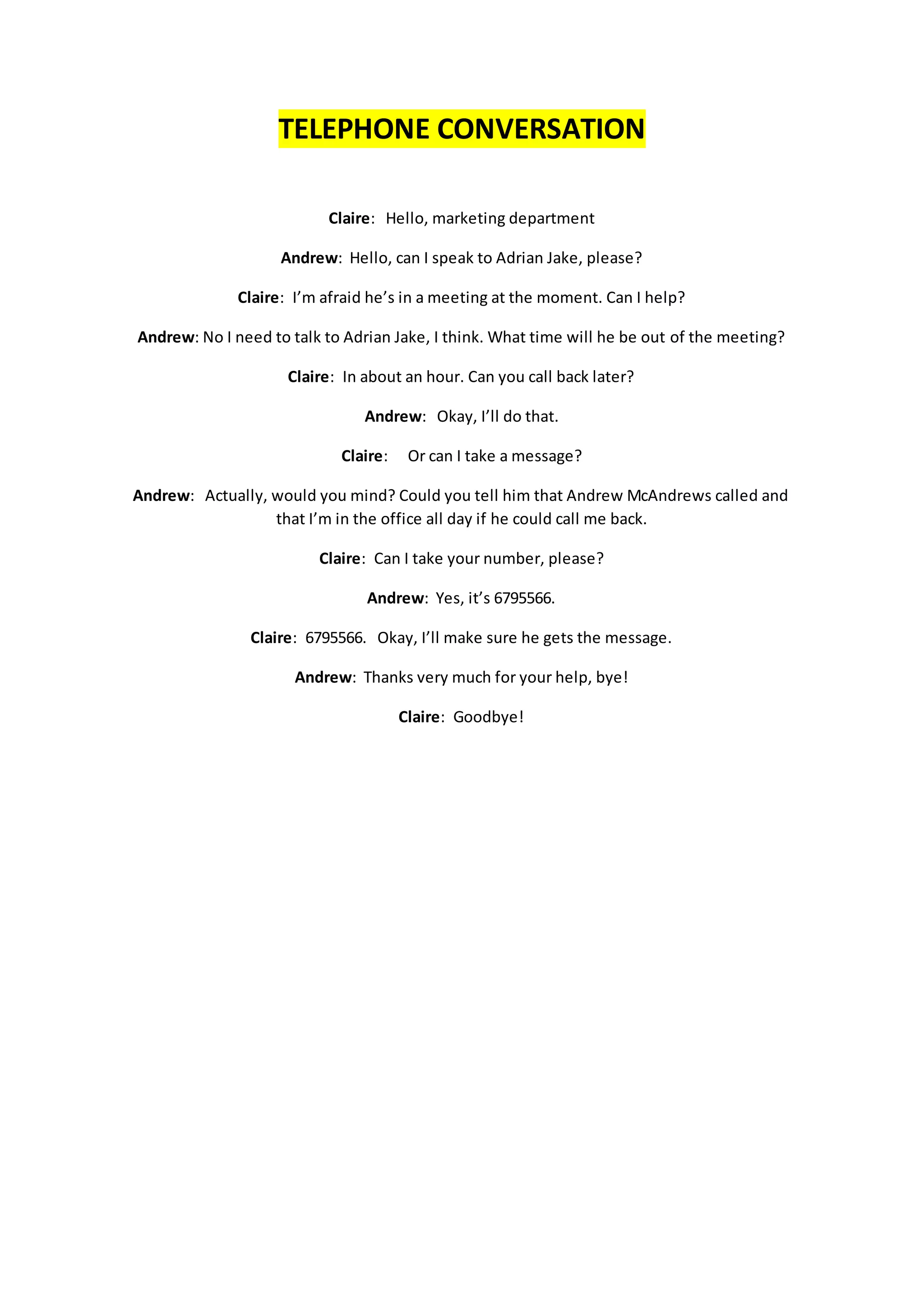 Andrew called the marketing department to speak with Adrian Jake but was told he was in a meeting. Claire offered to take a message for Adrian. Andrew provided his name and phone number and asked Claire to let Adrian know he should call back. Claire confirmed she would pass along the message.