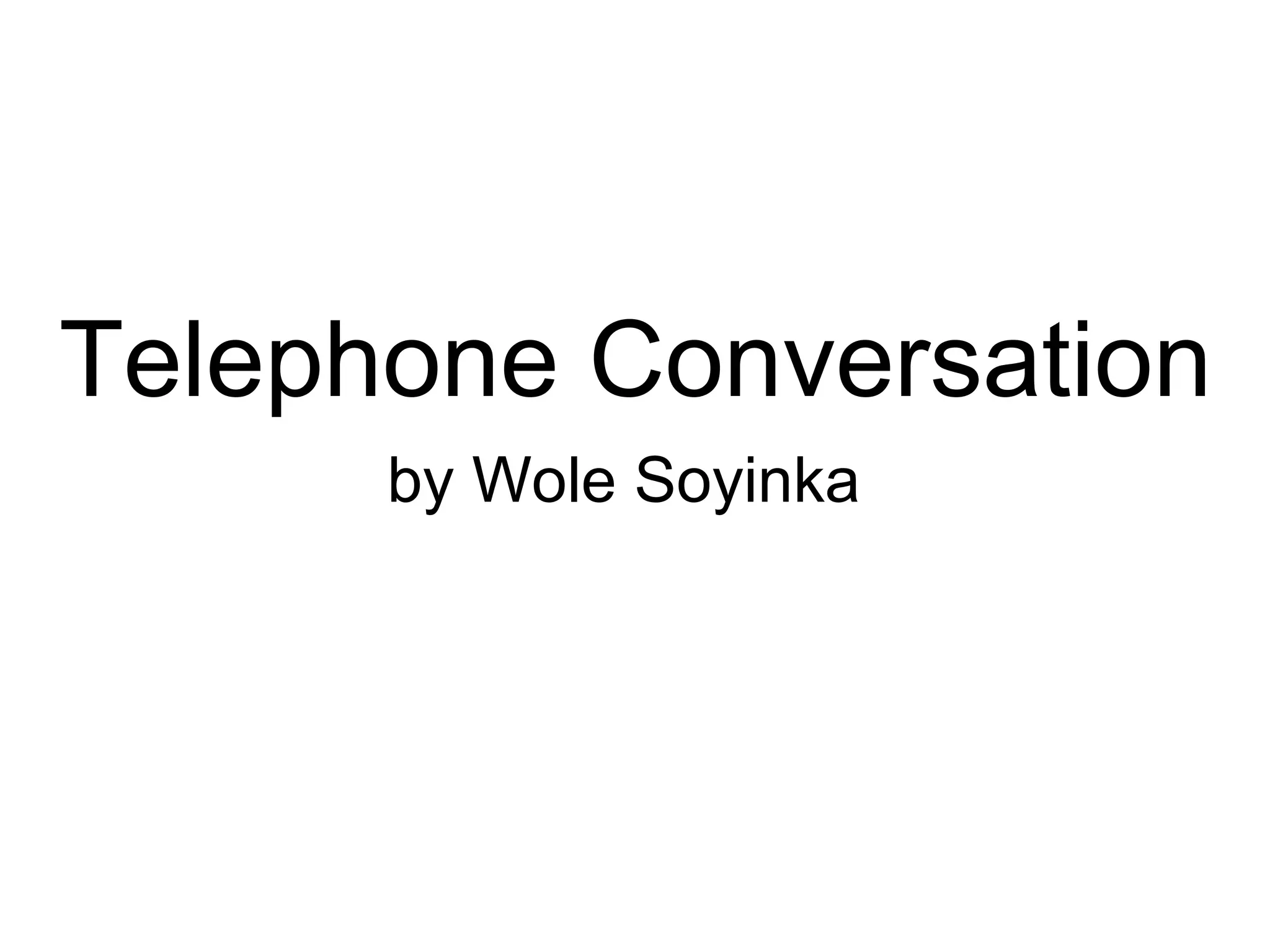 The poem depicts an interaction between a Nigerian man searching for an apartment and a potential landlady. Through their telephone conversation, the landlady focuses solely on discussing the man's skin color rather than apartment details. The man responds with wit and subtle irony to highlight the absurdity of her racism. While appearing polite, the landlady is revealed to be shallowly judging the man based on his race alone. The man's intelligence shown through his vocabulary contrasts with the savage stereotype the landlady assumes based on his skin color.