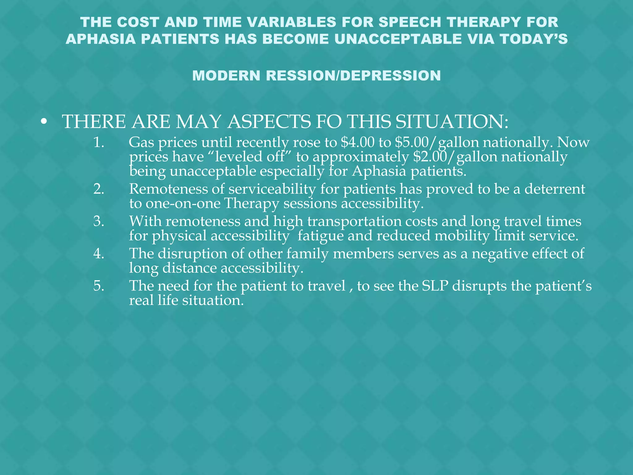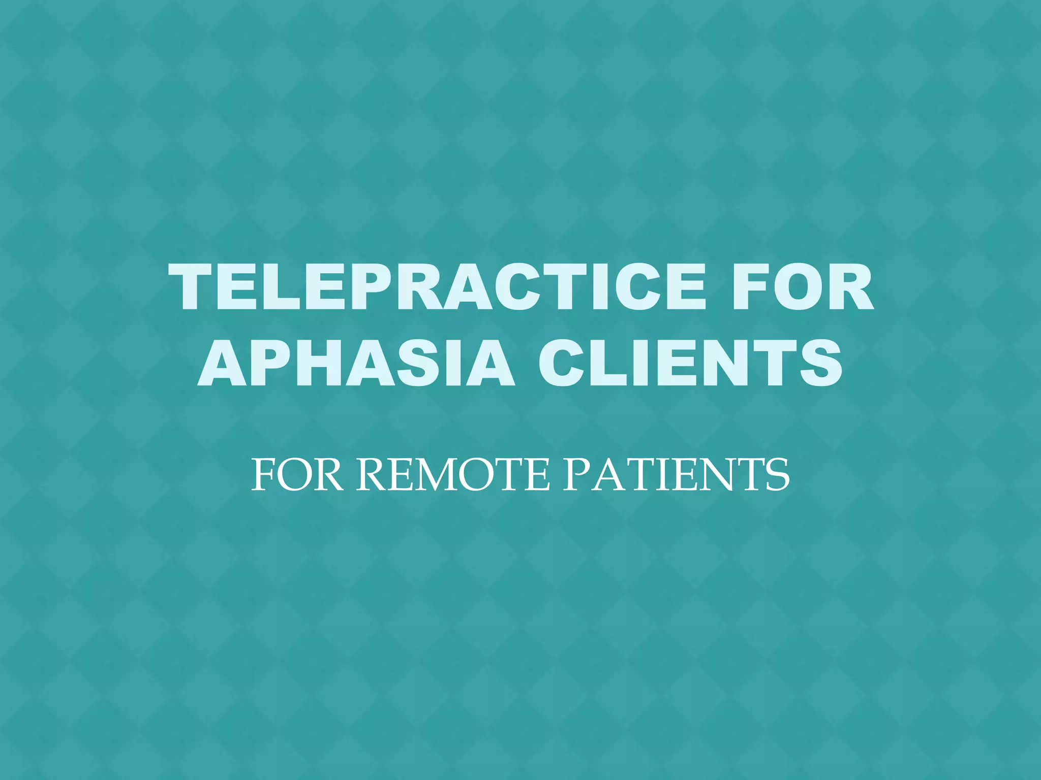 Telepractice, or remote speech therapy using telecommunications technology, can help address barriers to treatment for aphasia patients. Transportation costs, travel time, and lack of accessibility due to distance have made speech therapy inaccessible for many patients. Telepractice allows therapy to continue when patients are remote from providers. It provides an alternative to patients not receiving treatment due to accessibility issues. Implementing telepractice for aphasia therapy could help the large number of patients who are currently unable to receive needed treatment.