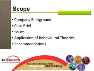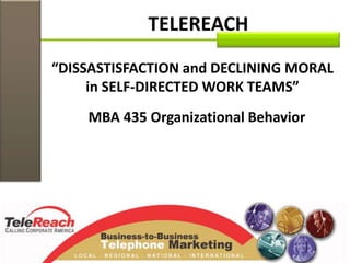This document discusses issues of dissatisfaction and declining morale among self-directed work teams at TeleReach's new factory in Lake Charles, Louisiana. The factory implemented a new production line and self-directed work teams, but various problems arose, including a lengthy selection process, poor communication between management and teams, and a lack of training and development. To address the problems, the manager Tom Martin should focus on human resource management, leadership style, and workplace improvement initiatives. Similar issues affected teams at the older Flagstaff, Arizona factory, so manager Bill Edwards needs to improve communication, involvement in decision-making, and introduce a rewards system. Overall, managers can prevent these problems in the future by increasing communication, involvement, and using a particip