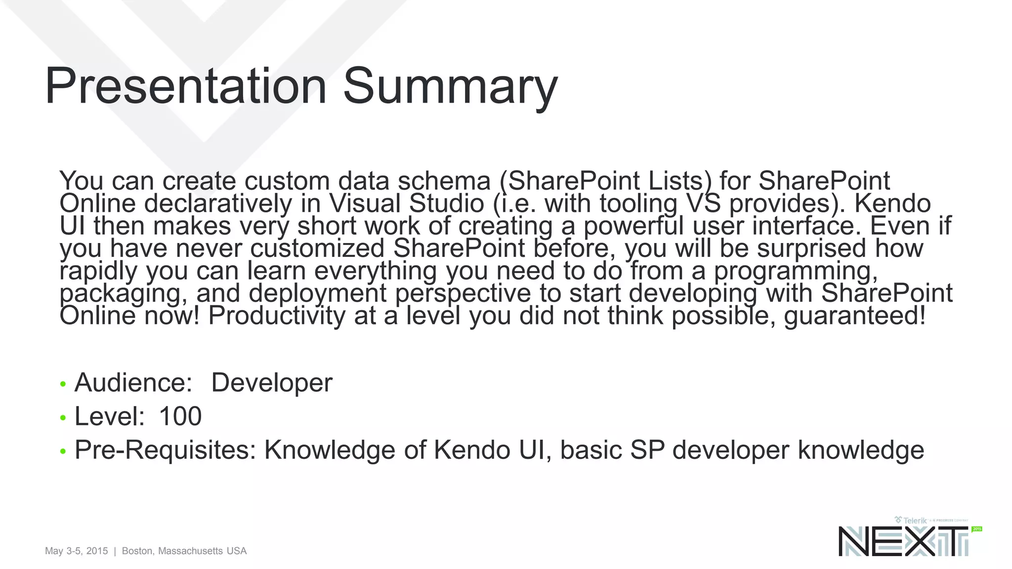 The document outlines a presentation by Ed Musters on using Kendo UI with SharePoint 2013 and Office 365, demonstrating how to create custom data schemas and deploy Kendo UI for improved user interfaces. It covers various topics such as deployment methods, creating lists, and integrating Kendo UI grids with SharePoint data. The session is targeted at developers with a basic knowledge of Kendo UI and SharePoint development.
