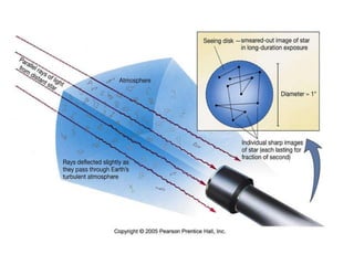 The document summarizes information about Saturn, Venus, binoculars, telescopes, mounts, and resolution. It describes Saturn as having a pale brown ring surrounding its sphere and yellowish-brown layers moving on its surface. Venus is described as very bright, slightly green, and rotating quickly. It provides information on magnification, aperture, focal length, and types of telescopes and mounts. It also discusses concepts like resolution, field of view, and seeing related to telescope observation.