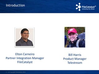 The document discusses a partnership between FileCatalyst and Telestream to accelerate file transfers. It provides an overview of FileCatalyst technology, including how it solves latency issues, its efficient transport protocol, and time savings compared to FTP. It also outlines FileCatalyst's integration with Telestream's Vantage video transcoding software, allowing fast delivery of media and metadata within Vantage workflows. Several example scenarios of this integration are described.