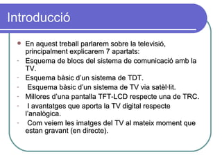 Introducció En aquesttreball parlarem sobre la televisió, principalment explicarem 7 apartats: Esquema de blocs del sistema de comunicació amb la TV. Esquema bàsic d’un sistema de TDT. Esquema bàsic d’un sistema de TV via satèl·lit. Millores d’una pantalla TFT-LCD respecte una de TRC. I avantatges que aporta la TV digital respecte l’analògica. Com veiem les imatges del TV al mateix moment que estan gravant (en directe).