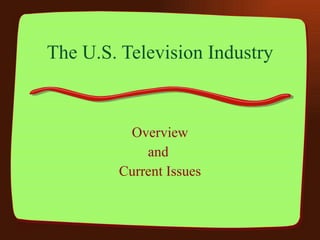 The document discusses the U.S. television industry, including its audience size, ownership trends, delivery options, and regulatory environment. It notes that the industry was historically dominated by the big three national broadcast networks (ABC, CBS, NBC) which had over 80% of primetime viewers in 1983. However, ownership restrictions and the growth of cable/satellite have led to increased options for viewers and consolidation among media companies over time. Regulation aims to balance competition and diversity with localism and public interests.