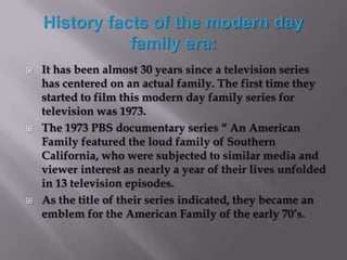 The document discusses two pioneering television series from the 1970s that centered around real families: An American Family from 1973, and The Osbournes from 2002. Both shows were media phenomena as they gave viewers an intimate look into the daily lives of families. The Osbournes in particular blended elements of a sitcom like introducing conflicts and resolutions with each episode, but was considered the first reality sitcom as it was unscripted and simply followed the family at home.