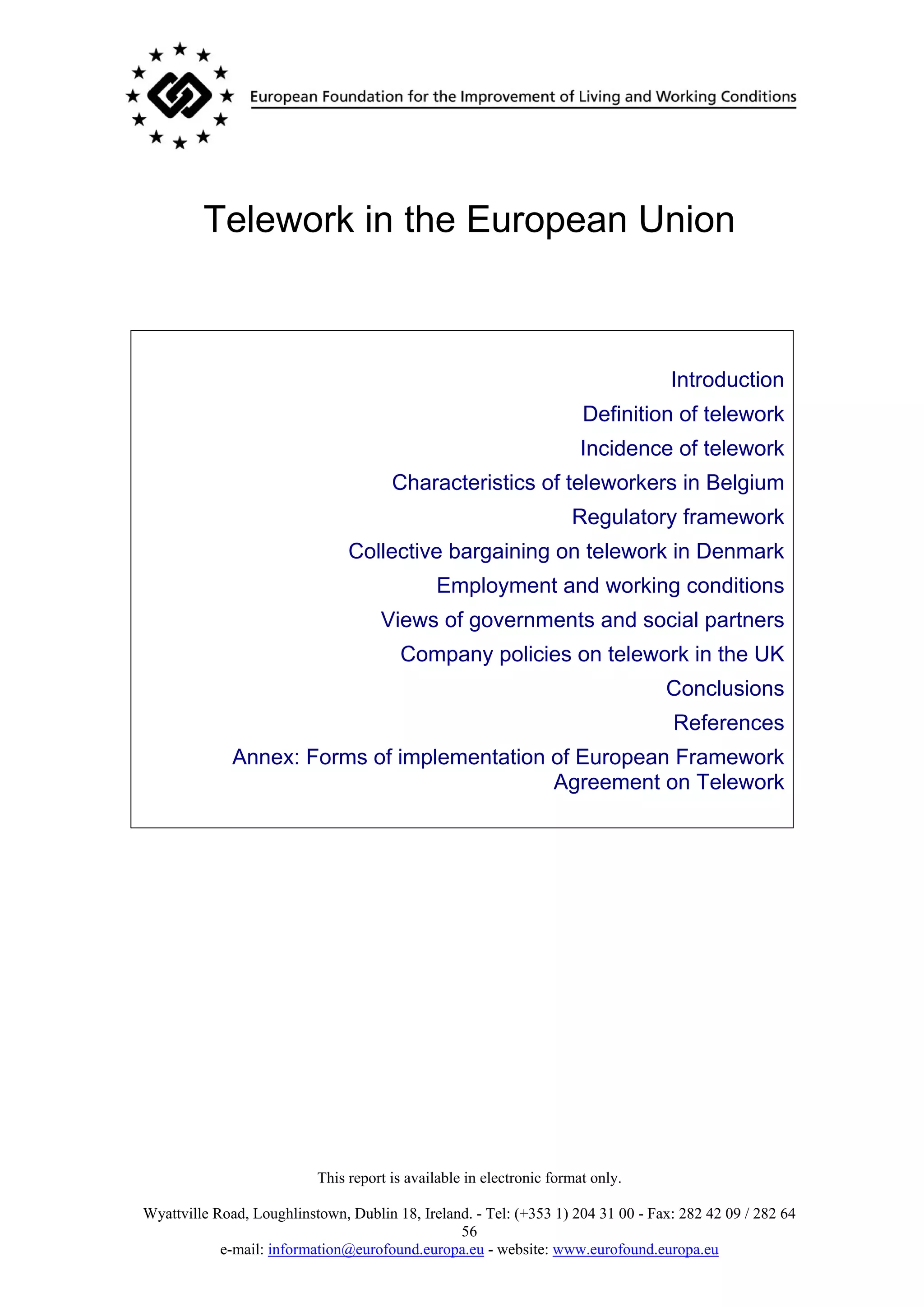 The document examines telework in the European Union based on a report by the European Foundation for the Improvement of Living and Working Conditions. It finds that telework has increased across the EU in recent years and is now used by 7% of employees on a regular basis. Countries with the highest rates of telework include the Czech Republic, Denmark, and Belgium. Telework is more common among higher skilled workers, in industries like real estate and finance, and for occupations in professional, managerial, and technical roles. The report provides an overview of the definition, regulatory framework, and implementation of the 2002 European Framework Agreement on Telework.