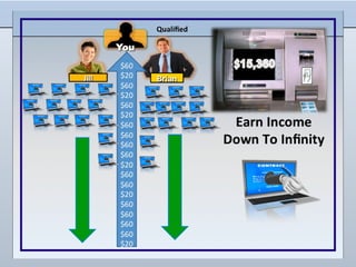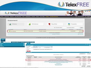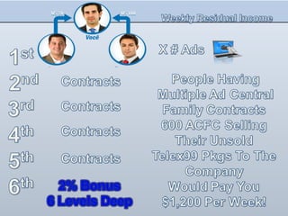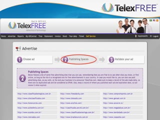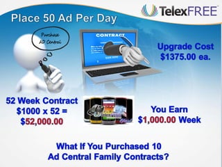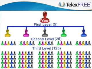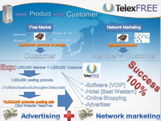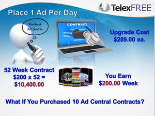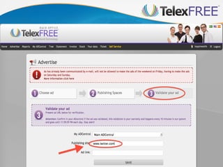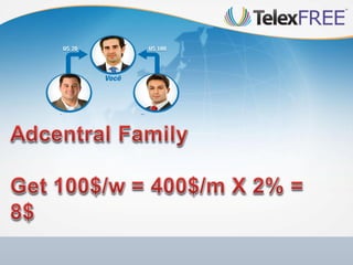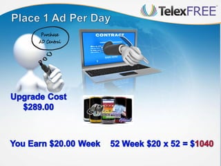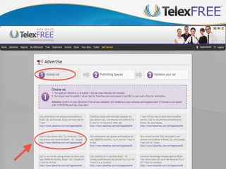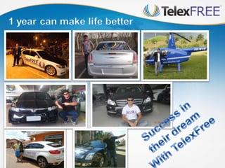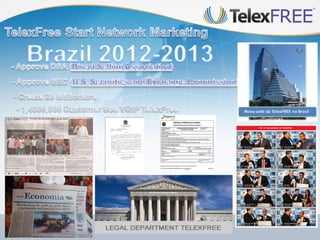 This document summarizes the TelexFREE marketing program. TelexFREE trains people in internet advertising skills through a 3 step program. Participants can earn income by publishing daily advertisements online or building a team. There are various ways to earn, including individual commissions, team matching bonuses, cycles bonuses, and the team builder pool bonus for enrolling others. The goal is to leverage the power of the internet to build a dynamic, explosive business by reaching over 1 billion consumers through viral advertising campaigns.
