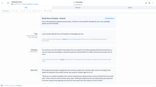 The document discusses the importance of storytelling in building a university's brand, emphasizing that each school has a multitude of smaller stories that collectively shape the larger narrative. It outlines the need for a structured approach to assess, choose, and shape stories effectively, highlighting the role of audience engagement and key messaging pillars. The document also introduces a creative workflow for story development and the use of formulas to enhance the storytelling process.