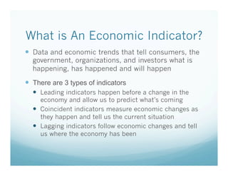 The document explains economic indicators, which are data and trends that inform consumers and investors about current and future economic conditions, categorized into leading, coincident, and lagging indicators. It emphasizes the importance of using these indicators in journalism to help people understand economic policies and make informed decisions, while also outlining a task to define a campus-specific economic indicator alongside others like student loan debt and gas prices. The document sets parameters for creating a sound and repeatable economic indicator that accurately reflects the campus economy's health.