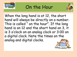 This document provides information about telling time on both analog and digital clocks: