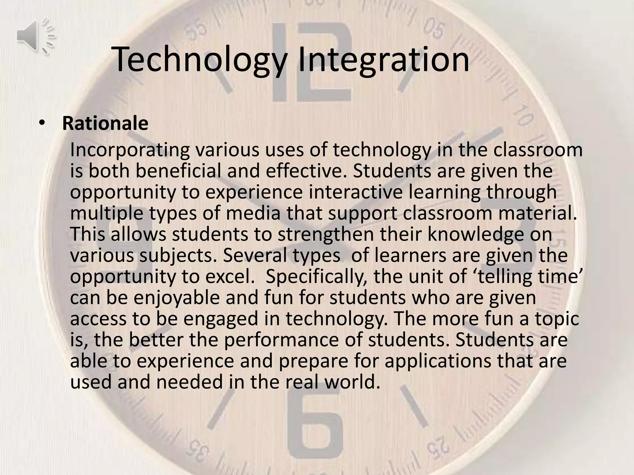The document discusses incorporating technology into a 4th grade unit on telling time. It provides examples of websites, apps, videos and other online resources that can help strengthen students' understanding of telling time in an interactive and engaging way. These include Khan Academy exercises on telling time via computers, telling time games and videos on YouTube, customizable worksheets on Math Goodies, and an app called "Telling Time Free" for iPads. The goal is to make learning to tell time fun and accessible through multiple media, in order to benefit different types of learners.