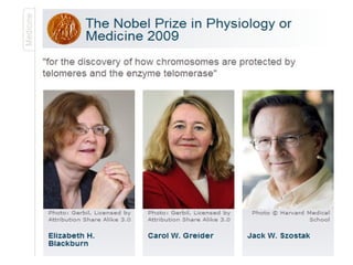Telomeres are repetitive nucleotide sequences located at the ends of chromosomes that protect the ends from deterioration or fusion with other chromosomes. They shorten each time a cell divides until a length is reached that triggers cell senescence or death. The enzyme telomerase maintains telomere length by adding telomeric repeats to chromosome ends using its own RNA component as a template. Telomerase is active in germ cells, stem cells, and cancer cells, allowing indefinite cell division, but not in most somatic cells, limiting their replicative lifespan.