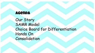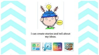 This document discusses differentiation and student-centered learning. It provides examples of using choice boards and various apps to engage students and allow them to demonstrate their understanding in different ways. The document encourages using technology like iPads to promote student collaboration, creativity, and independent learning. Specific apps and online resources are suggested for activities like creating digital clocks, practicing math skills, and using devices' built-in features like text-to-speech.