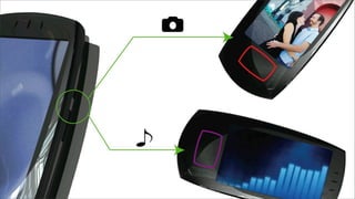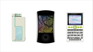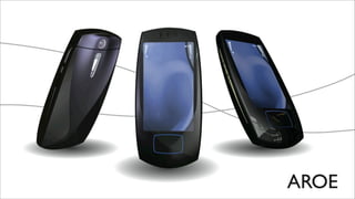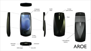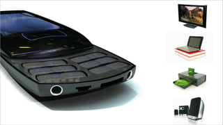 The document outlines a collaboration between Telus and OCAD University to develop new cellphone concepts. It discusses developing phones that distinguish Telus and appeal to youth. Several phone concepts are proposed: Jewelle, a messaging phone with a QWERTY keyboard; DOMO, a multimedia phone with a large screen and camera; and MK-6, for seamless integration with entertainment systems. Each concept would have accompanying accessories reflecting their emotive qualities. The goal is to create phones that are tangible, valuable and marketable.