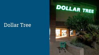 Dollar Tree offers a wide variety of goods for $1 or less. It caters to budget-conscious shoppers looking for kitchenware, cleaning supplies, toys, food, and seasonal items. Maurices provides fashion-conscious clothing and accessories for women of all sizes in a relaxed atmosphere. Famous Footwear aims to offer a personalized shopping experience compared to larger chains while remaining competitively priced. Nordstrom Rack sells Nordstrom brand items at discounted prices to recoup costs and attract more budget-minded customers. Buy Buy Baby is a one-stop shop for all baby needs with knowledgeable staff and a clean environment catering to both casual and hurried parents.