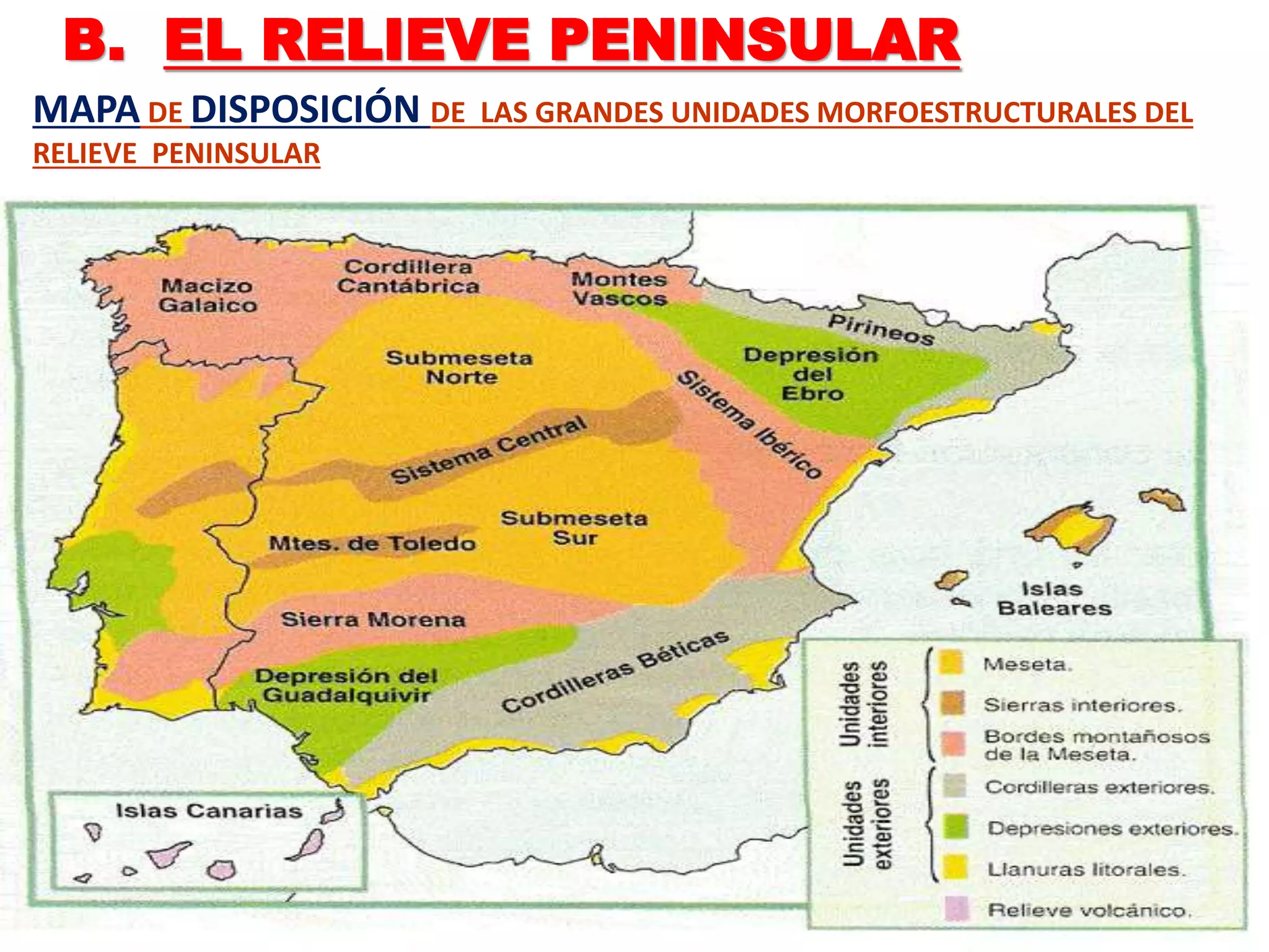 La Meseta es una gran llanura elevada situada a unos 600-800 m de altitud. Se diferencian en ella el zócalo paleozoico, las sierras interiores como el Sistema Central y los Montes de Toledo, y las cuencas sedimentarias interiores con formas de relieve como los páramos, campiñas y cuestas. Los rebordres montañosos de la Meseta incluyen el Macizo Galaico-Leonés, la Cordillera Cantábrica con el Macizo Asturiano y la Montaña Cantábrica, el
